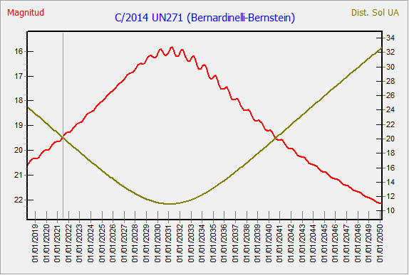 A few days after the discovery announcement, 2014 UN271 has been found to show cometary appearance in new CCD images obtained by observers at station codes L81 & K93.Basically this object, that was first seen as an asteroid of magnitude ~22 by DES in 2014 at a distance of 29 AU, approaching the Sun was growing his coma and tails. As of June 2021, it was 20 AU from the Sun shining at a magnitude ~20.After the discovery of the cometary coma, the new comet has been designated C/2014 UN271 (Bernardinelli-Bernstein). This comet will reach perihelion, its closest point to the Sun, in January 2031 at about ~11 AU away from the Sun.