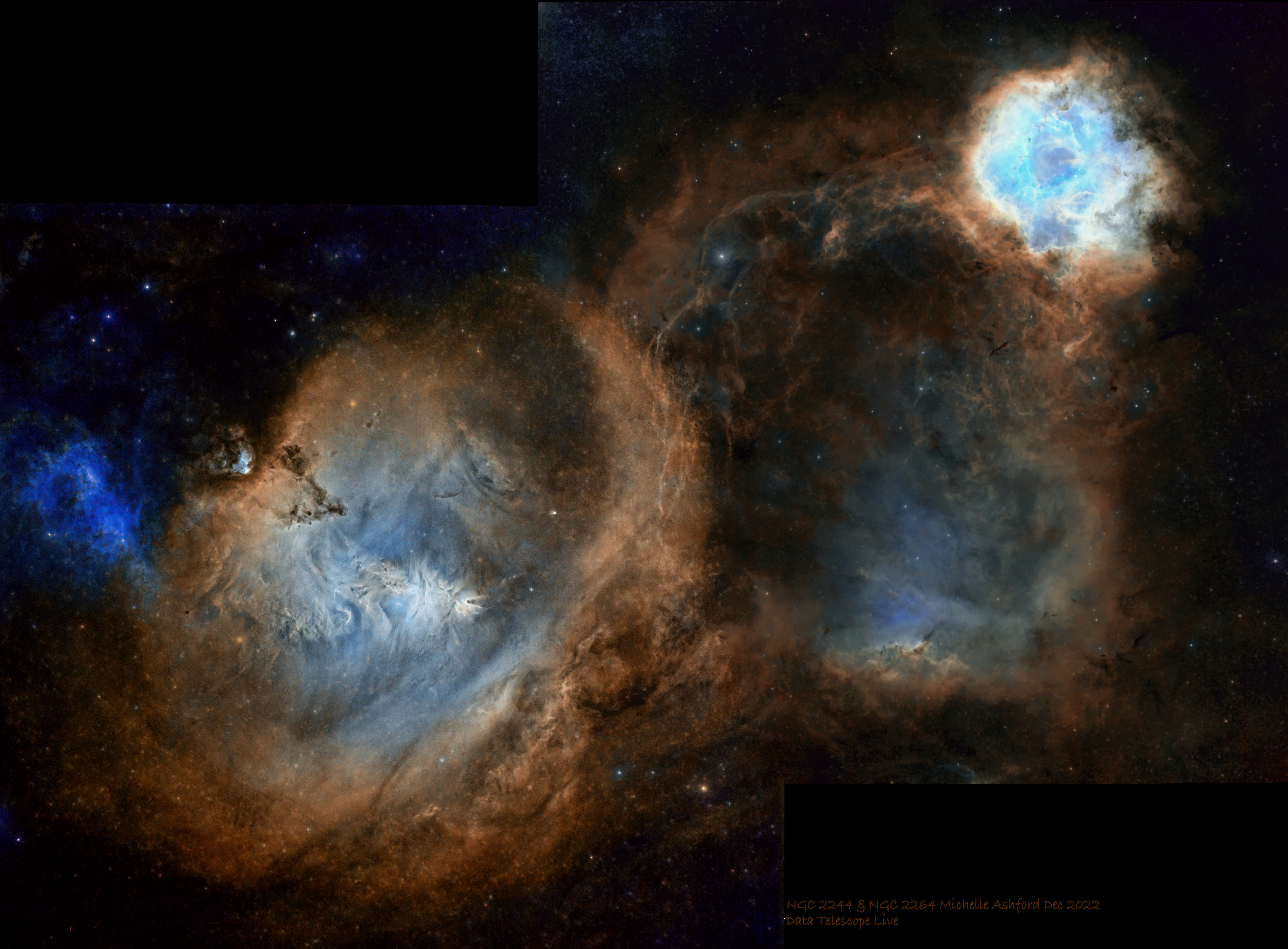 This is a two-panel mosaic of the NGC 2264 and NGC 2237 in the constellation of Monoceros.