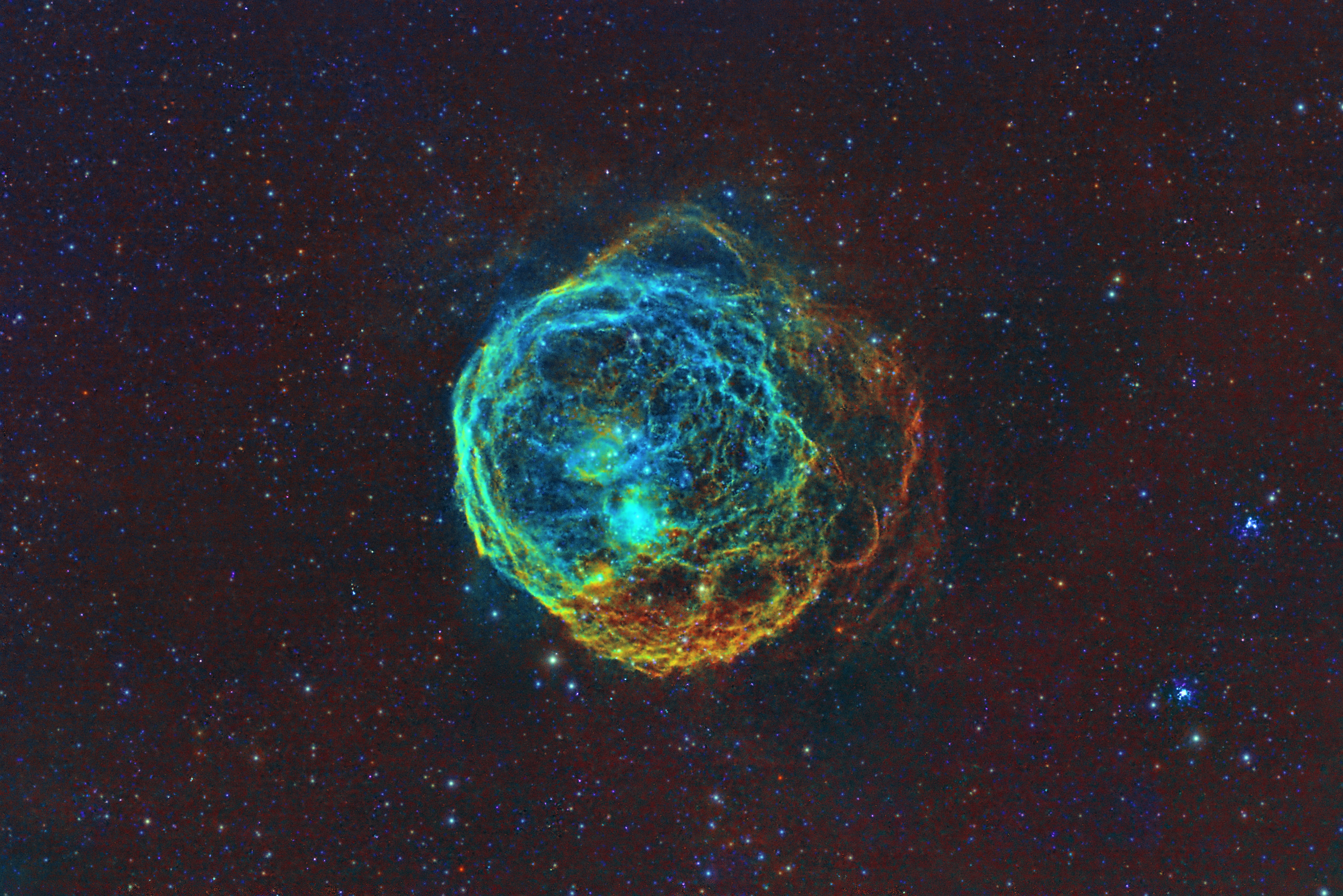 Henize 7 is a cosmic super bubble that is thought to be the remnant of multiple supernovas. It is approximately 300 light-years in diameter and is located in the LMC. Processed in PI using BB's HSO version to bring out the beautiful colors.