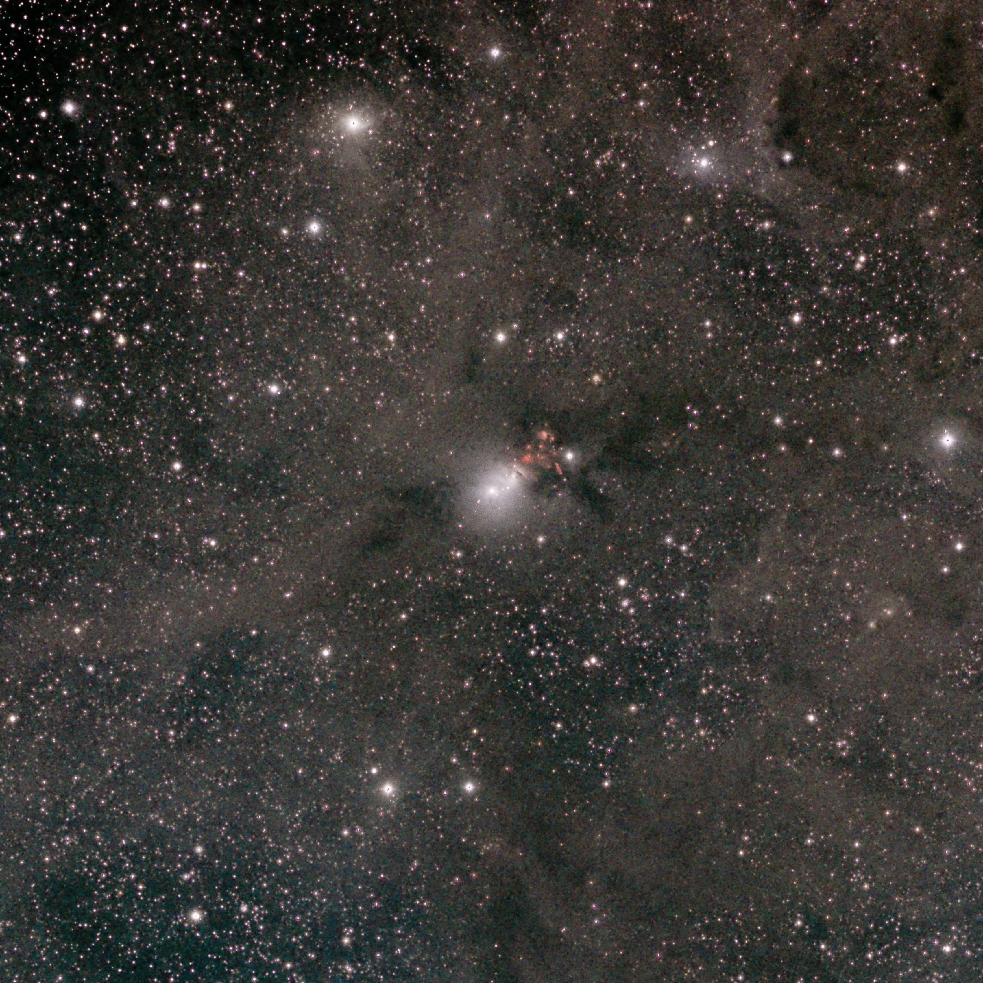 NGC1333 is at the center and vdB12 and 13 are near the top. Among the intense red spots are a few Herbig-Haro objects. HH7, 8, 9, 10, and 11 can be seen to form a line. HH objects are young stars formed when stellar plasma ejected in a polar jet collides with the surrounding molecular cloud. The HH catalog lists a few dozen such objects near NGC1333.