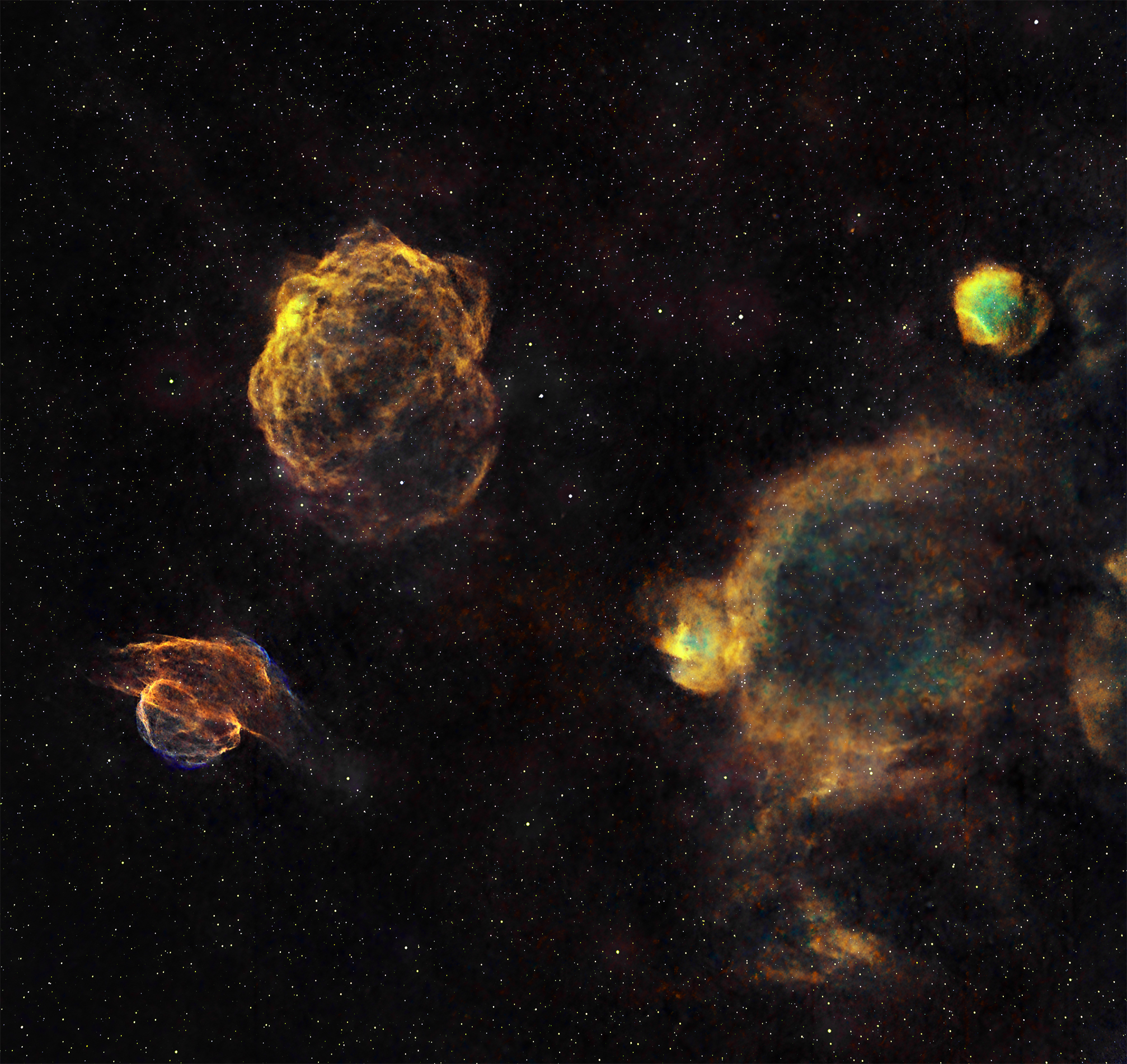 Supernova remnant, Sh2-224, and Sh2-223 in northern Auriga are seen here in an HST palette.